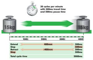 ישנו עומס של 15 ק"ג בתנועה, שנע בתדירות של 30 מחזורים לדקה, עם מחזור עבודה של 50% (=2000ms למחזור):