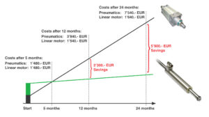 מערכות חשמליות אכן יקרות יותר לרכישה מאשר בוכנות פנאומטיות פשוטות, אך ניתוח מעמיק של סך כל העלויות לאורך חיי השירות מצביע על כך שמנועים ליניאריים תעשייתיים בכלל, ושל LinMot בפרט, יכולים להחזיר את ההשקעה הראשונית תוך מספר חודשים או שבועות, אפילו אם רק על-ידי פעולת הנעה פשוטה בין שתי נקודות. הדוגמה הבאה תנסה להמחיש נקודה זו. ביישום כלשהו עם מהלך מאוזן בין שתי נקודות במרחוק של 400 מ"מ,